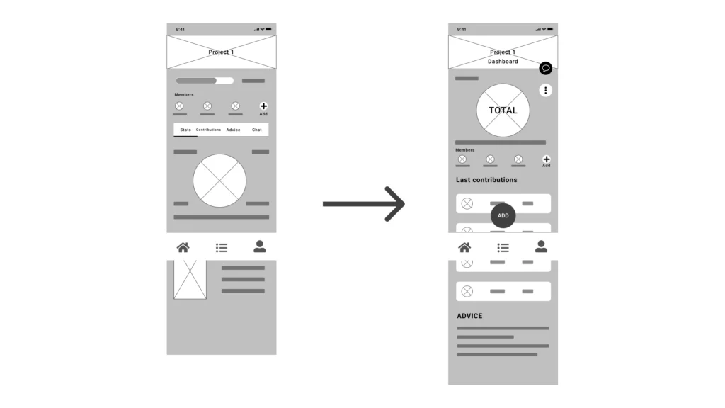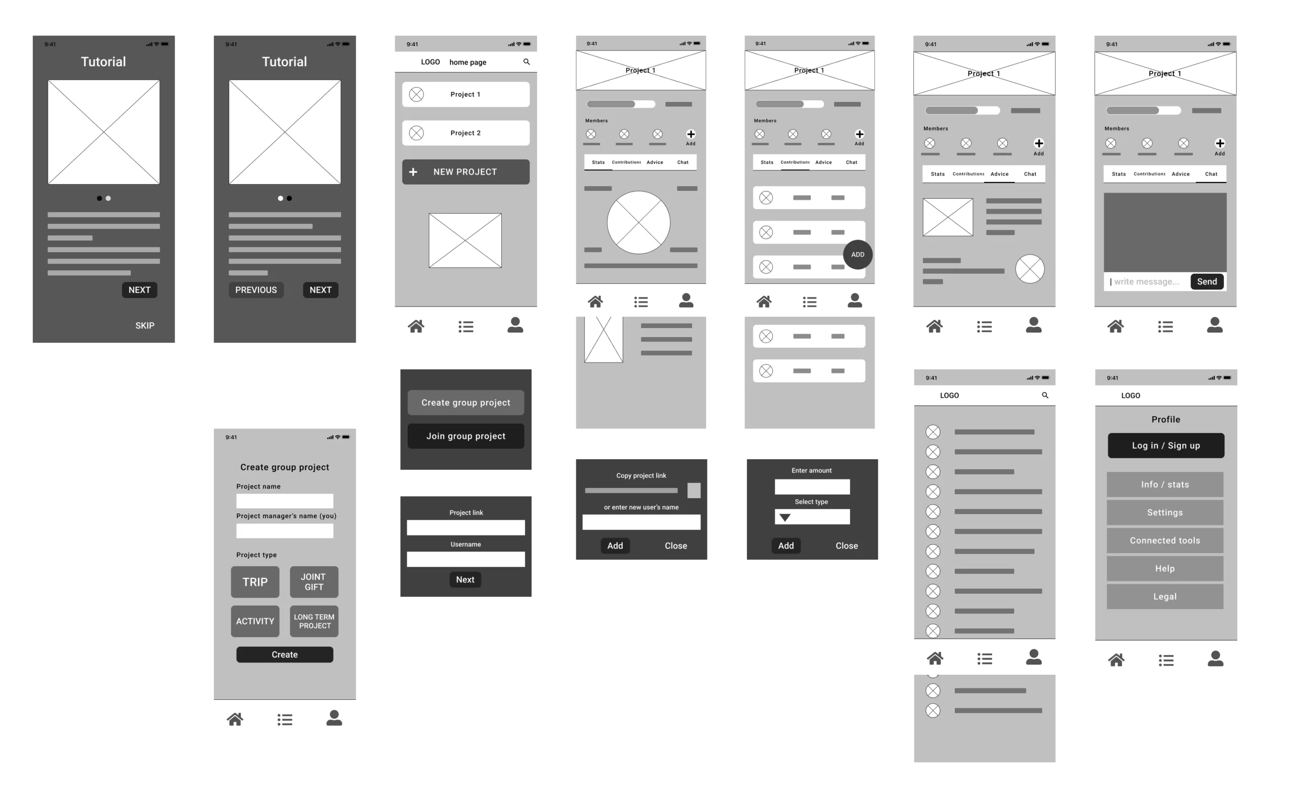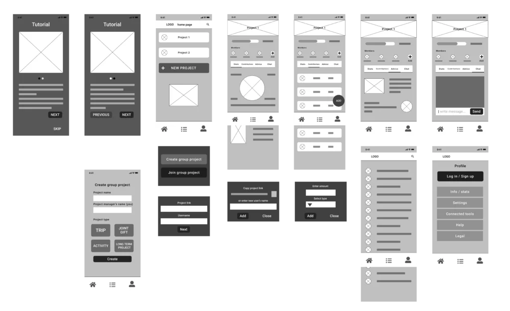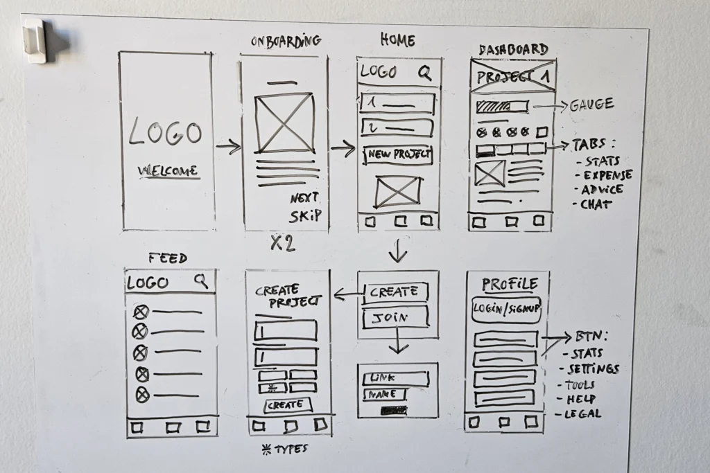 J’ai réalisé un wireframe des pages du flow principale de l’application, à la main dans un premier temps pour itérer plus facilement et commencer à dégrossir le zoning. Puis je suis passé sur Figma pour réaliser la version digitale, qui a ensuite évolué en prototype basse fidélité.