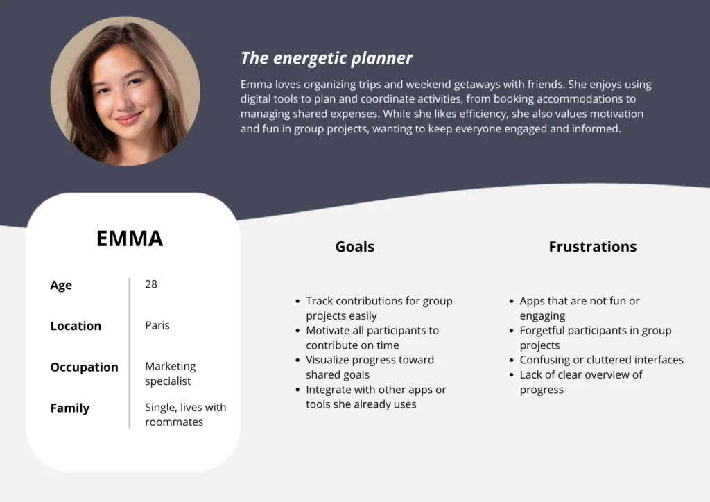 - Emma est une voyageuse sociable qui a besoin d’un moyen simple pour planifier et gérer un objectif d’épargne commun, car elle souhaite que son groupe reste organisé et motivé.
