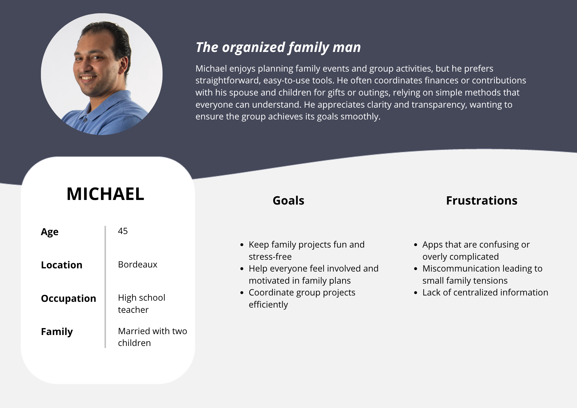 - Michael est un père de famille organisé qui a besoin d’un outil simple pour créer et suivre des objectifs financiers communs, car il souhaite que sa famille se coordonne et réalise ses projets ensemble.
